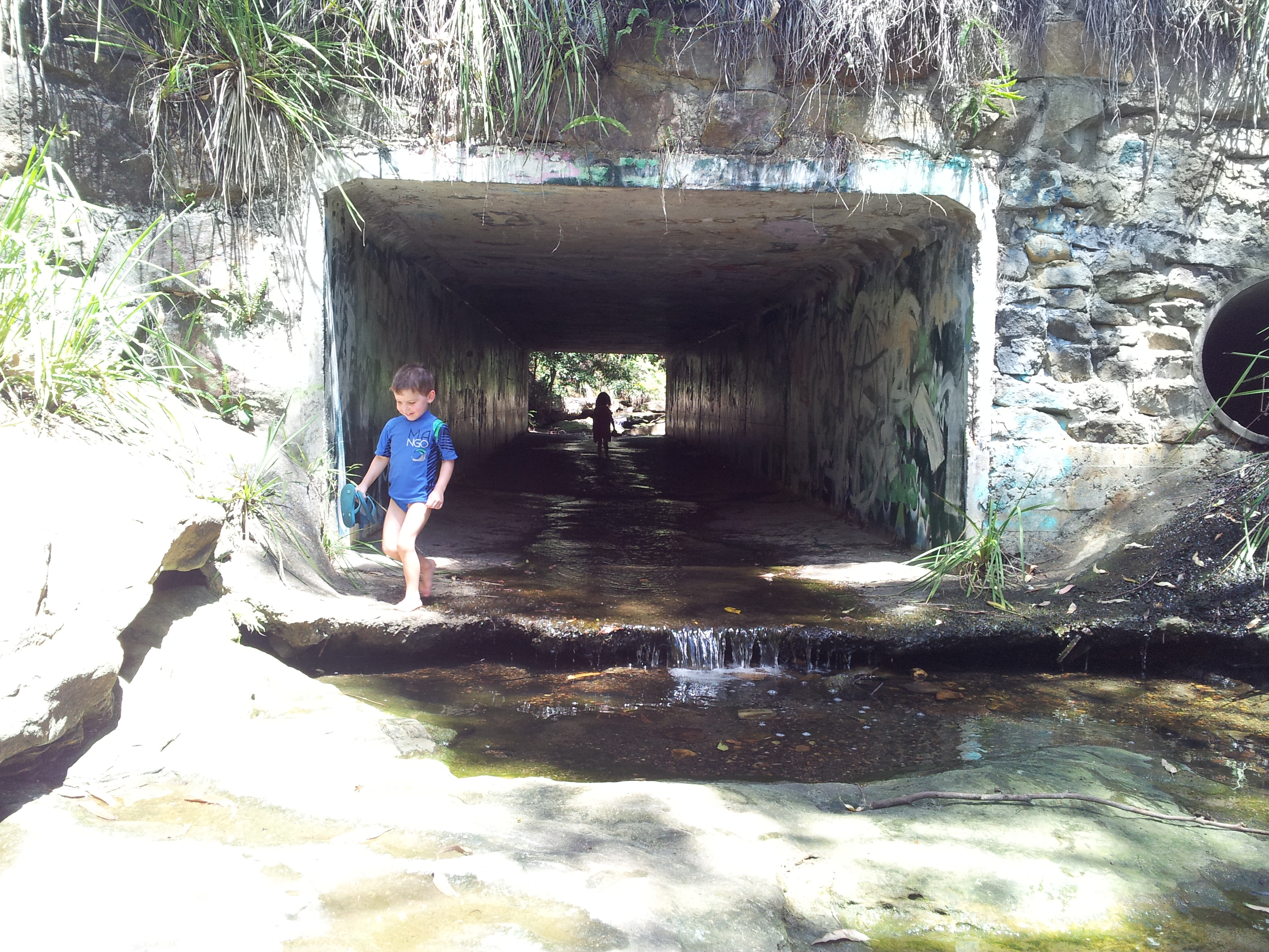 Phoebe and Blake love our secret place. Every time we visit Nanny and Poppy, they want to visit the tunnel. They shout in there, revelling in the reverberating acoustics. They splash through the water barefoot, the green algal slime squishing between their toes. They reach for the cobwebs above, and float leaf boats down the canal. At the other end, they search for tadpoles in the cool, clear pool, and try to spot water dragons in the knee-high grass at the creek’s edge.