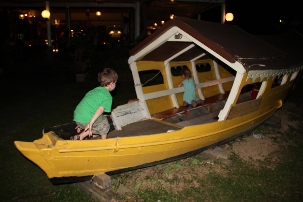 The James Brooke Bistro, named after one of the white Rajahs of Sarawak, sits on a grassy lawn right beside the river. Sipping a beer on the colonial verandah and watching the kids play on the grass, fairy lights and river in the background, was a great way to spend an evening. The yellow sampan on the grass outside was a hit with the kids, day and night.