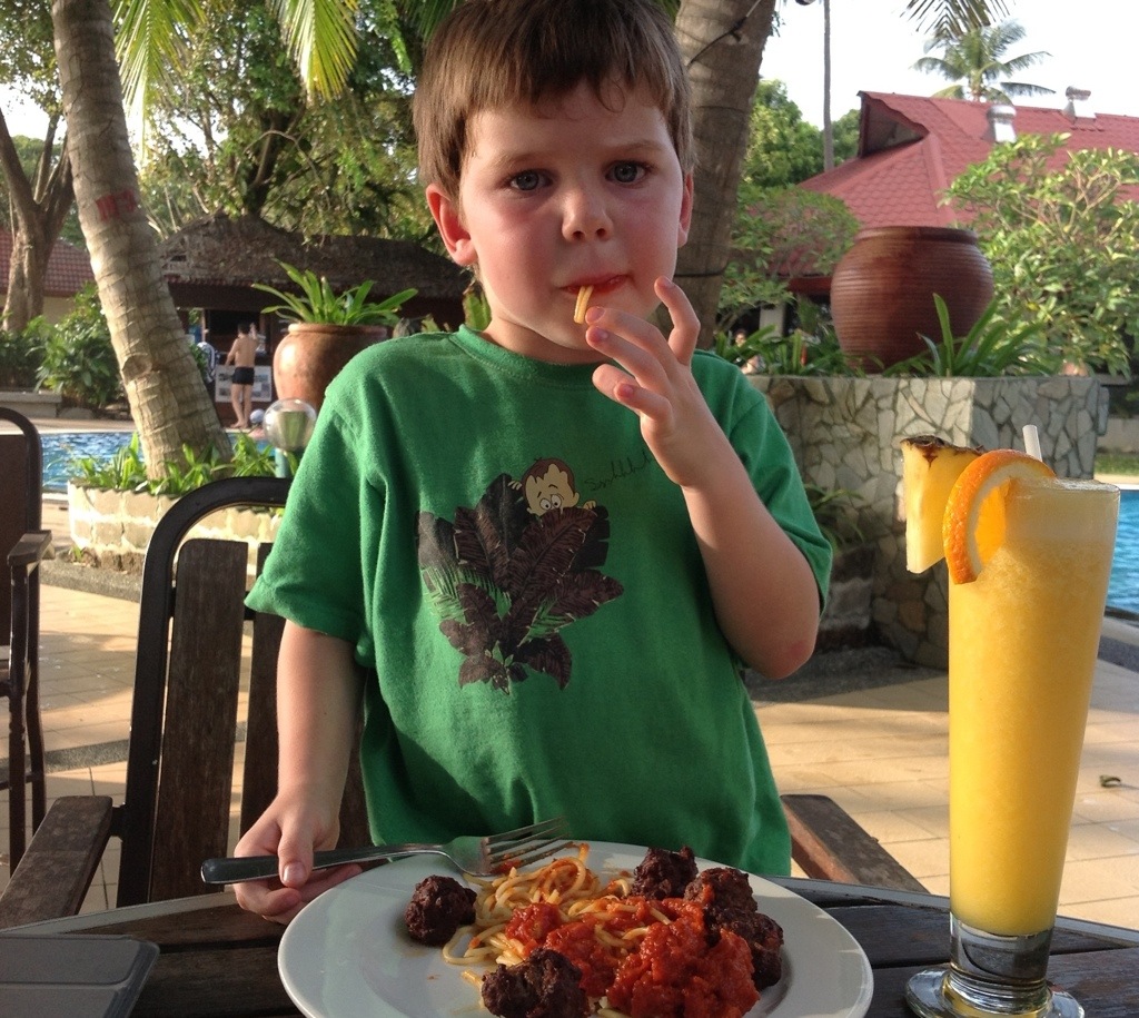He had spaghetti bolognese in KL, and Kuching, and on the Santubong Peninsular. He had pizza in the Red Garden hawker’s centre in Penang, and spaghetti and meatballs on Pulau Langkawi. Don’t ask me why spaghetti is preferable to noodles. I have no idea. Actually, I lie. The kid is a tomato sauce demon. That’s why.