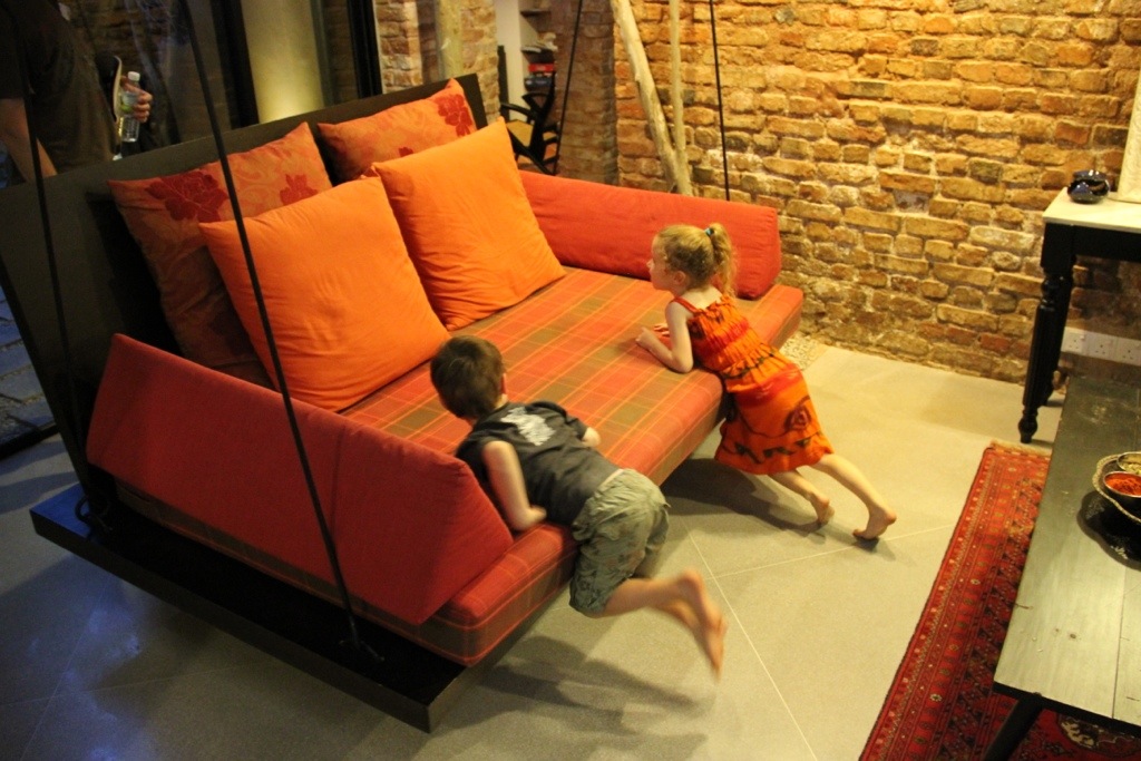 Keen on what we’d read and heard about George Town’s charismatic heritage district, we’d booked three nights in a little bed and breakfast called Spices, in Lumut Lane. Once a series of shophouses, the row has recently been transformed into a gorgeous little oasis, tucked away in a corner of the historic centre of town. We arrived in the darkened street in our cab, two kids asleep in the back seat. Unremarkable from the outside, the plain front doors opened to reveal a cosy, welcoming foyer, with a swinging lounge, perfect for sleeping twins. We didn’t get a shot of that, but here they are, awake and enjoying the swinging lounge.