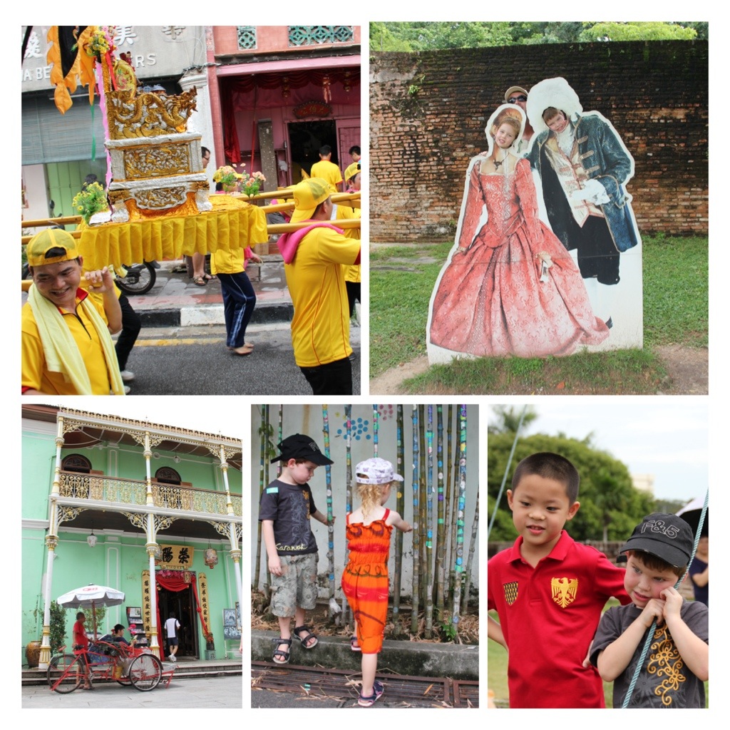 We saw passing processions, stopped by (the unremarkable) Fort Cornwallis for a snap in colonial getup (who’s that photo bomber?), visited a Chinese mansion, stuck stickers on bamboo (seemed like the thing to do), and made new friends.