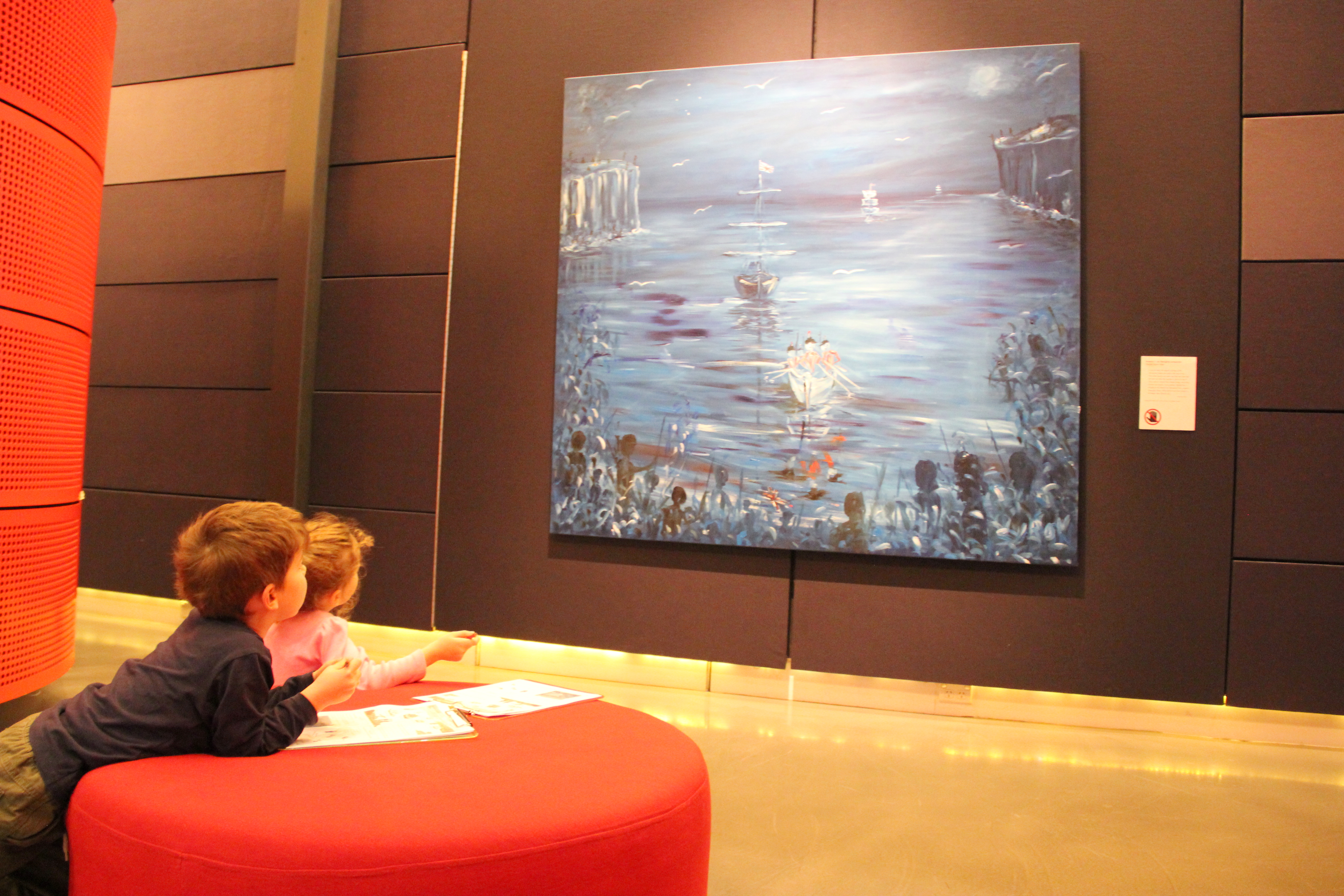 The painting below is a stop on the MoS Kids’ guide, and it really captured the imaginations of Phoebe and Blake. I try to talk to the kids as much as I can about the Aboriginal history of Australia, but it’s been difficult conceptually for them to understand the meaning of “Aboriginal”, and our migrant history. This artwork (I should have recorded its title – it’s beautiful) allowed us some meaningful discussion about the meeting of cultures, and indigenous history and culture.