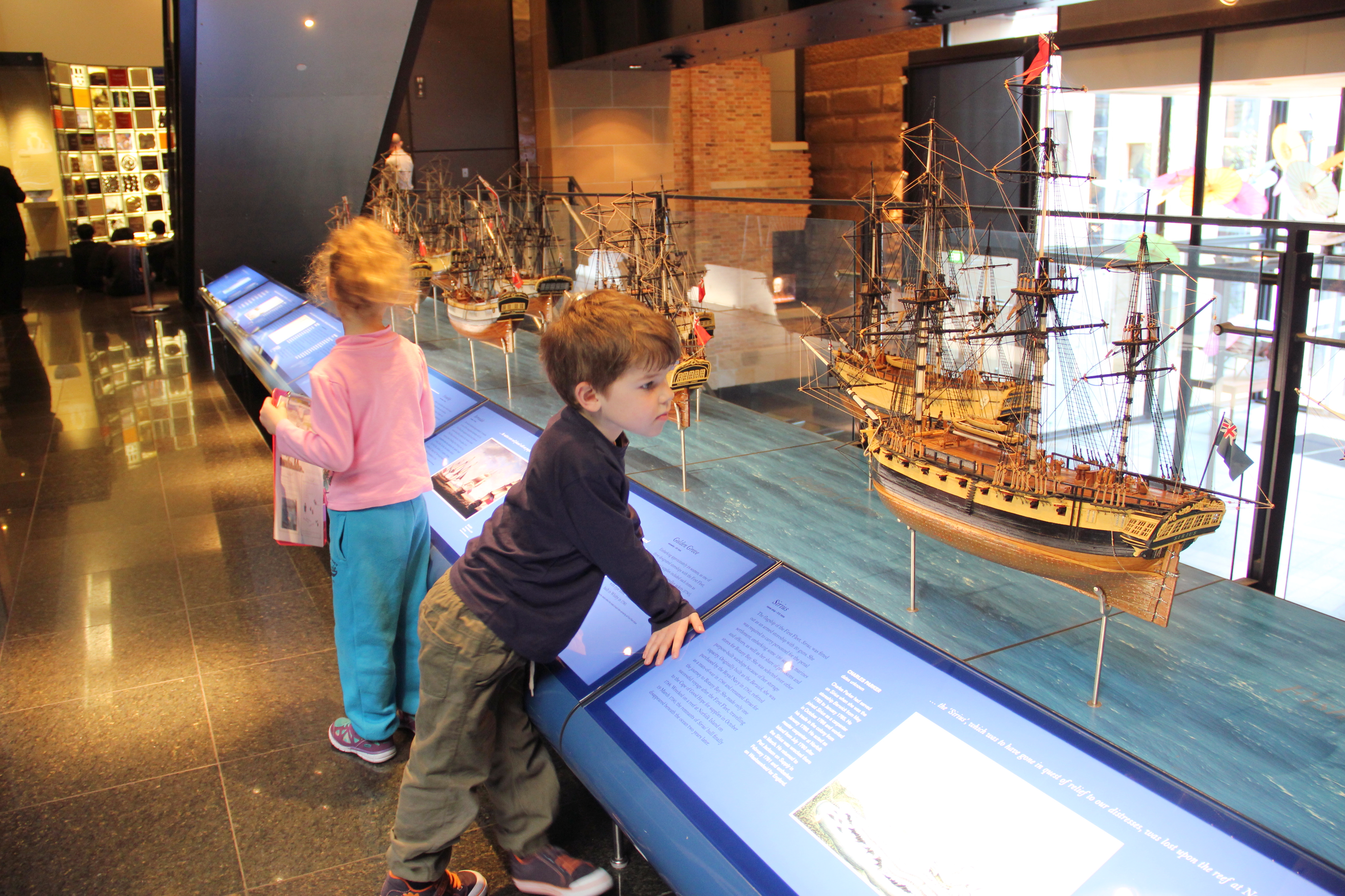 The First Fleet is here in scaled model form. They’re brilliant pieces. We talked about the convicts chained below decks, the dreadful conditions on board, and the role our convict ancestors played in building this city. Phoebe and Blake don’t quite get the idea of ancestors just yet. They were most impressed by the number of ropes on the ships.