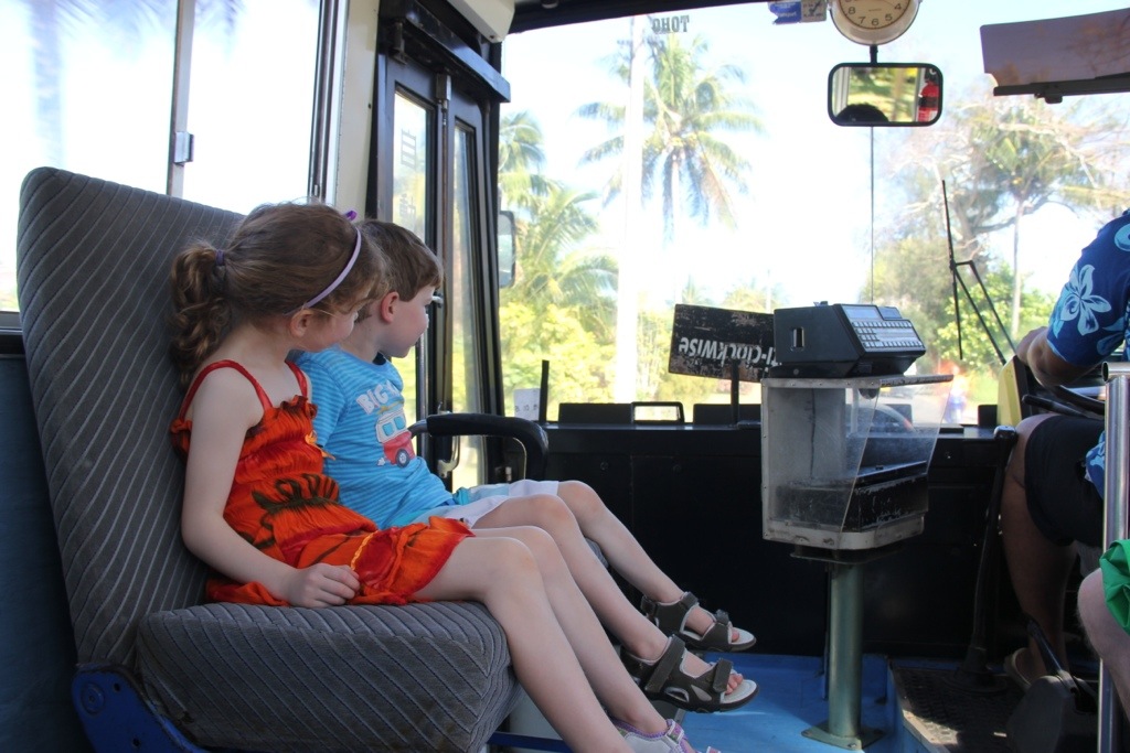 A 32km road circles Raro along the coast, as the inland is mountainous rainforest. You can either take the clockwise bus, or the anticlockwise bus, but you’ll always end up in the same place. On our first bus ride into town – about 16km from Titikaveka – we managed to snag the clockwise route, with the happiest bus driver in the world. (And why wouldn’t you be happy, living here?) He opened the door as he passed tourists on motor scooters, shouting “Want a race!?” and then proceeded to grace us with a pretty impressive rendition of “Hallelujah” through his mic. The kids were enthralled. He set a bit of a standard, which, sadly, none of the other bus drivers we have met so far have rivalled, but look out for him if you go.