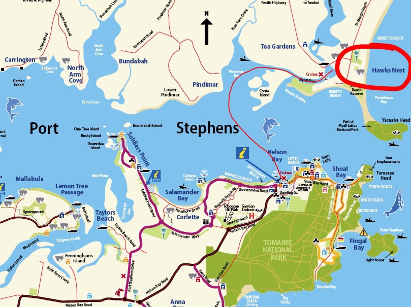 Hawks Nest sits on the northern headland of Port Stephens, bordered on the east by the ocean, Myall Lakes National Park to the north, the Myall River to the west, and the Yacaaba Headland, part of the Myall Lakes National Park, and Port Stephens to the south. Tea Gardens, Hawks Nest’s similarly tranquil twin town, is situated just across the Myall River and connected by the Singing Bridge.