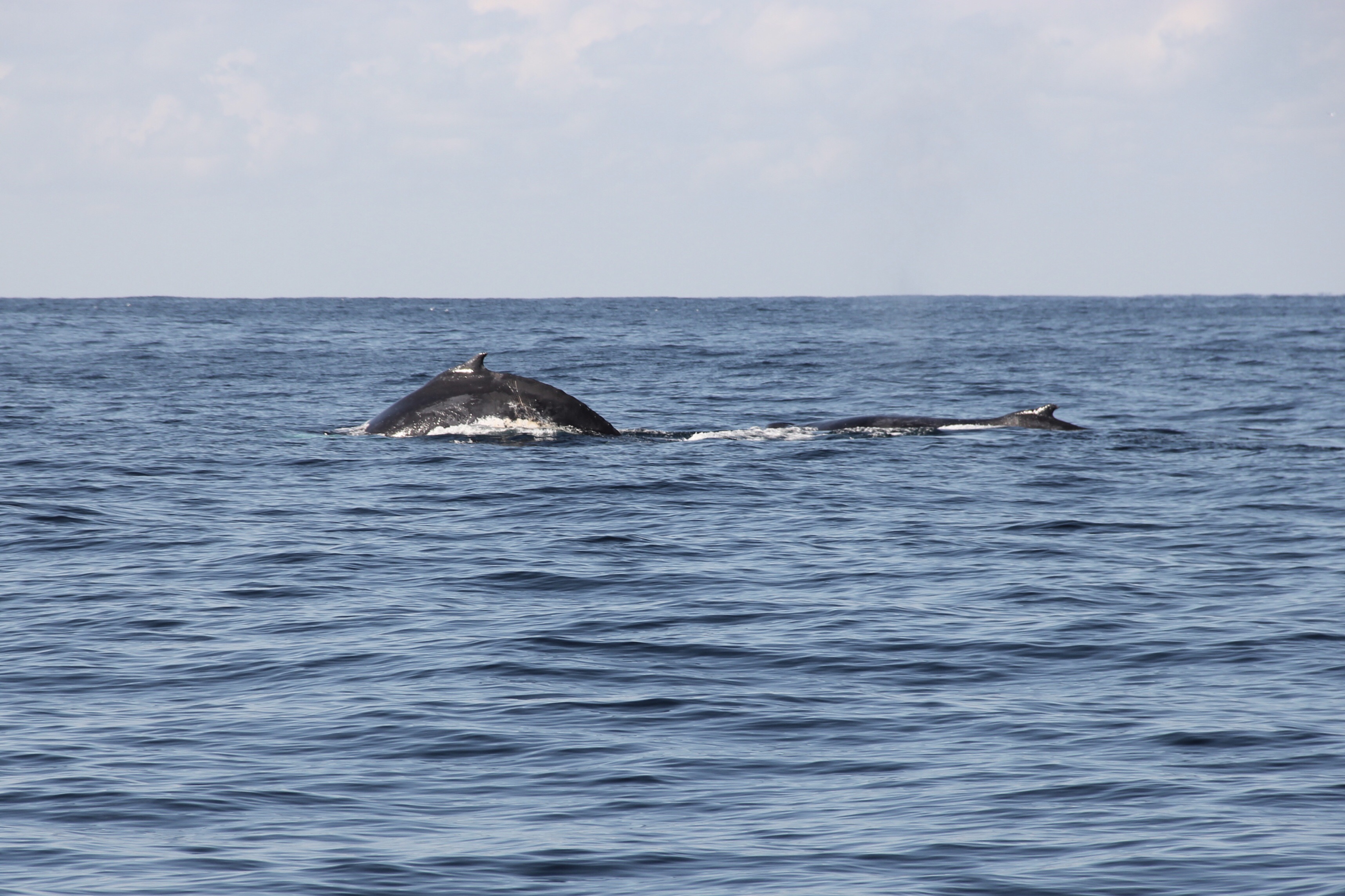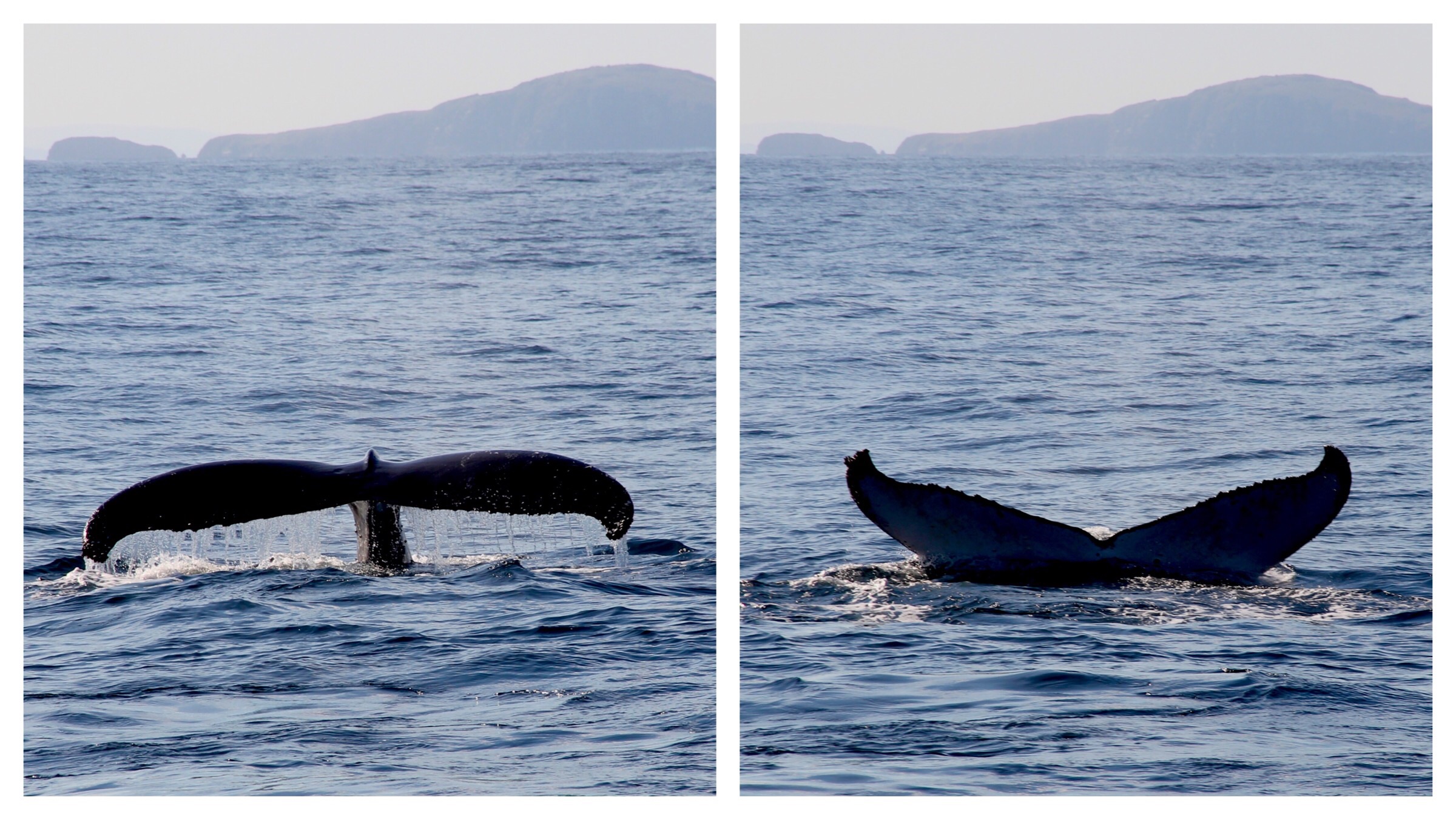 The dive times of this pair were quite long, so it was difficult to keep track of them once they submerged. Another duo popped up in front of the boat, and we caught a nice view of their tails before they disappeared.