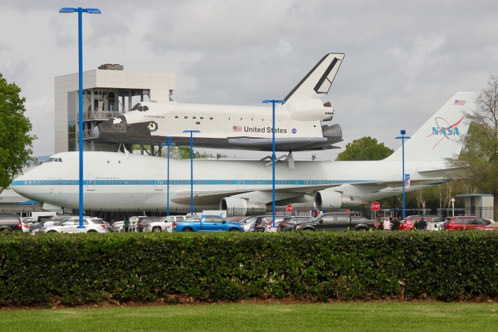 Venture into a replica space shuttle set atop an historic 747 shuttle carrier.