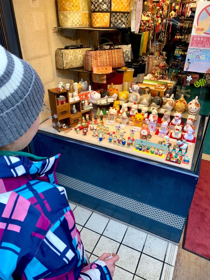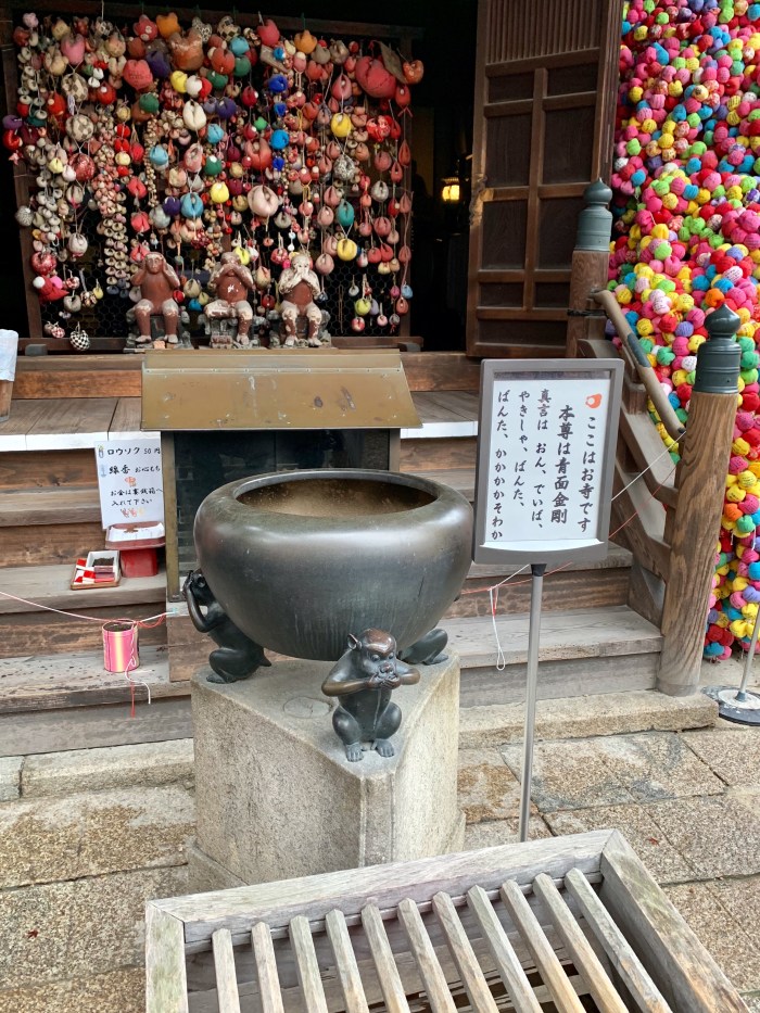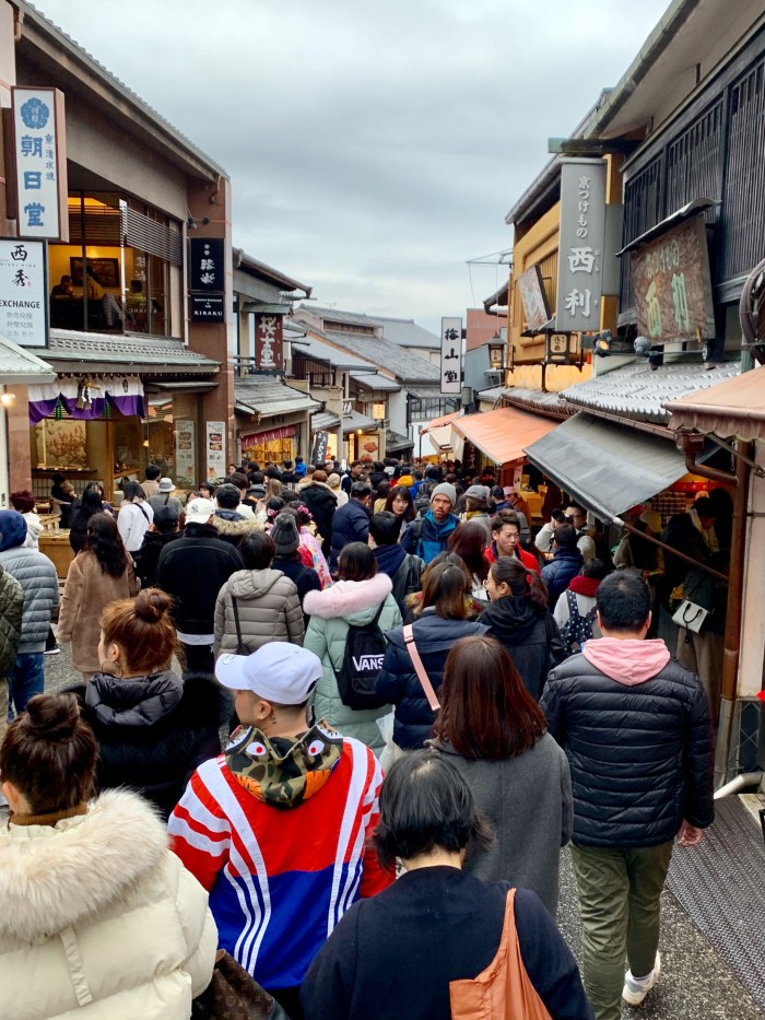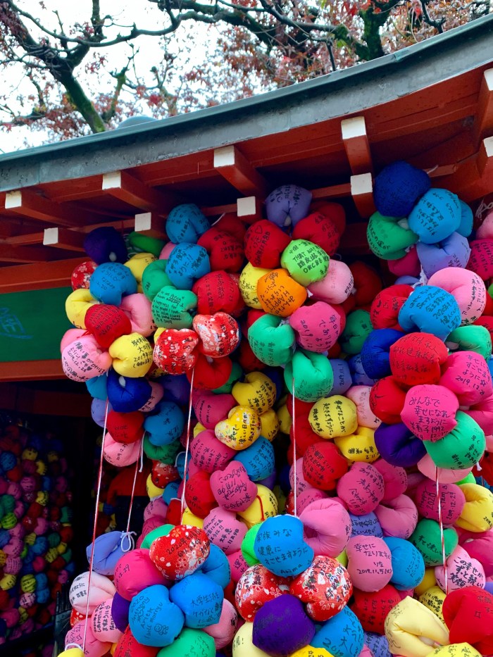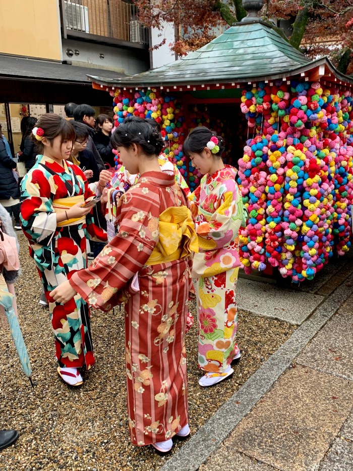 New Year is a big holiday here, so there are masses of people everywhere, especially at the temples sprinkled throughout the city. I loved seeing many women and couples in Japanese traditional garb for their visits to the temples. We popped into Yasaka Koshindo temple to see the worshippers writing their new year wishes on colourful balls called ‘kukurizaru’. The cloth balls represent the good faith monkeys, and the three wise monkeys sit in the temple ready to grant wishes if the worshippers are willing to give up one of their greeds. It was beautiful!