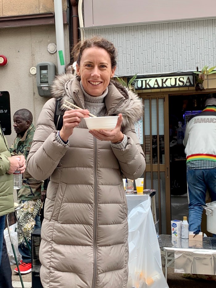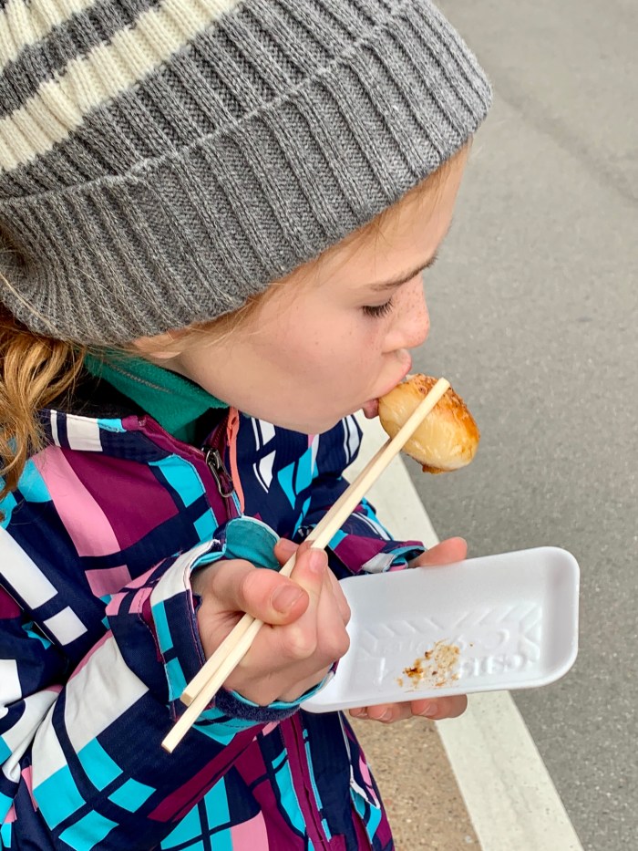 On the street near the station, my saké and leek soup was warm and delicious. Phoebs is quite partial to the dango dumplings.