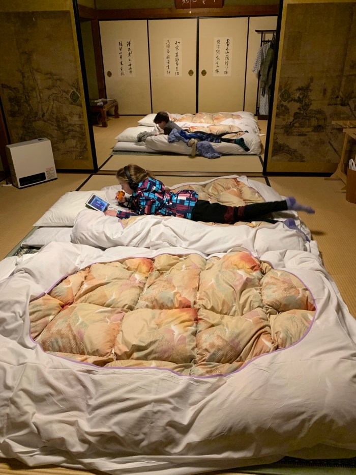 What’s special about Koyasan is that of the 117 temples in the tiny town, around 50 operate as Shukubos, offering lodging for travellers within the monasteries. We stayed at Eko-in, which is one of the bigger temples – you can book online for some, or through the local Koyasan Shukubo association. At Eko-in, the price includes a traditional Japanese tatami room with futons for sleeping, vegetarian meals (dinner and breakfast), meditation sessions, access to the morning ceremony and fire ritual, and the hot spring onsen baths.