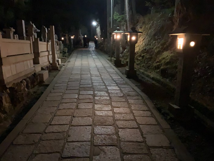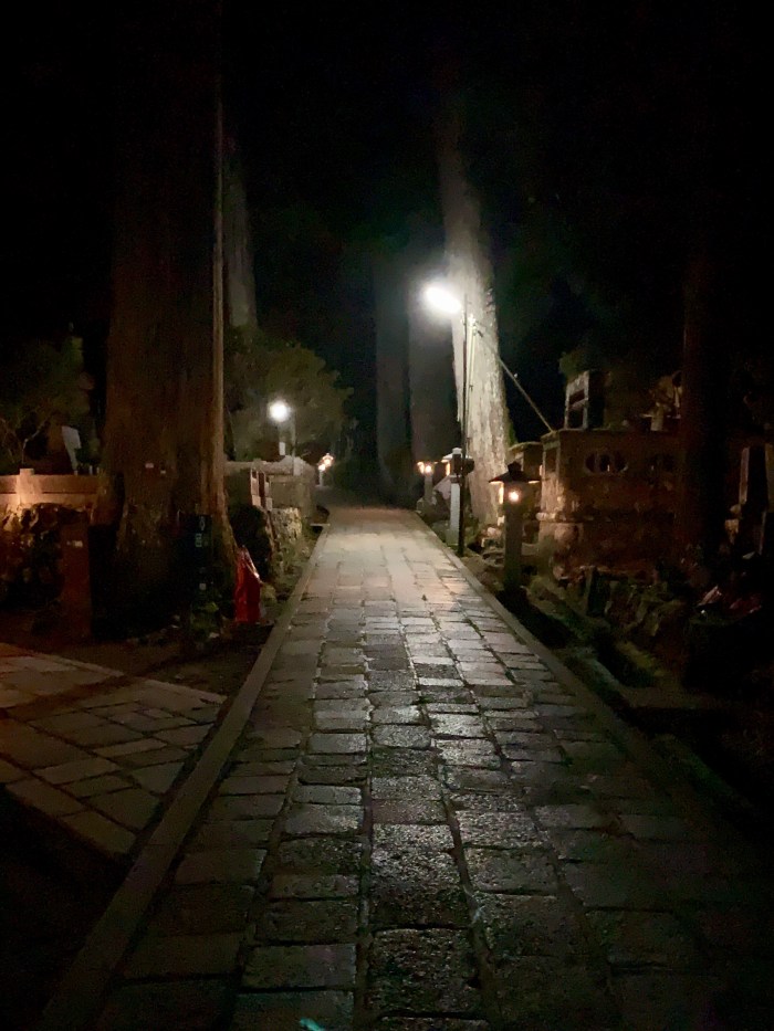 At 7pm we took the night tour to Okunoin, the mausoleum dedicated to Kobo Daishi, surrounded by a towering Japanese cedar forest and Buddhist cemetery filled with moss-covered shrines and stones. Led by local Shingon monks, the tour is a must when in Koyasan.