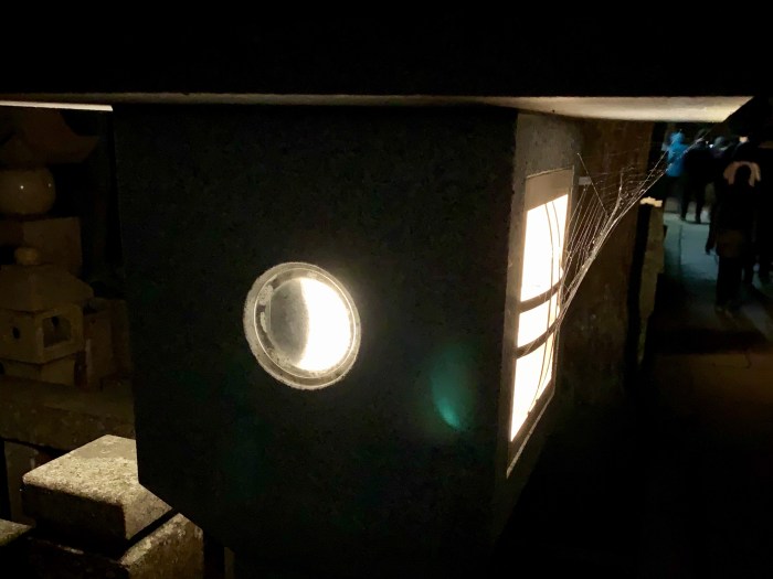 Travelling through the cemetery, we passed three bridges. At the third, we cleansed ourselves by tossing water onto the statues of Buddha (too cold to wash ourselves – pics in the daytime in my next post), removed our beanies (even though the night air was below zero) and crossed the bridge. No photography is permitted past this point. Our monk guide recited a mantra for Kobo Daishi and told us about the hundreds of lanterns hanging in Toro-do – the main building of the complex – where, in the day, visitors can write letters to Kobo Daishi. Two lanterns are believed to have been burning for 900 years. There are so many lanterns now that an additional temple has been constructed to house them.