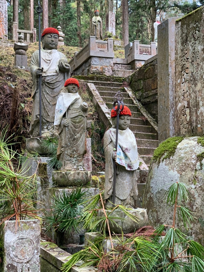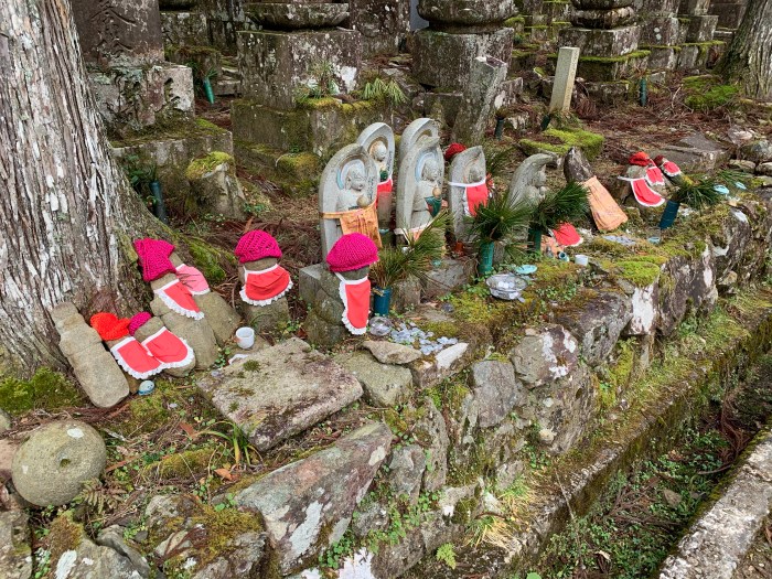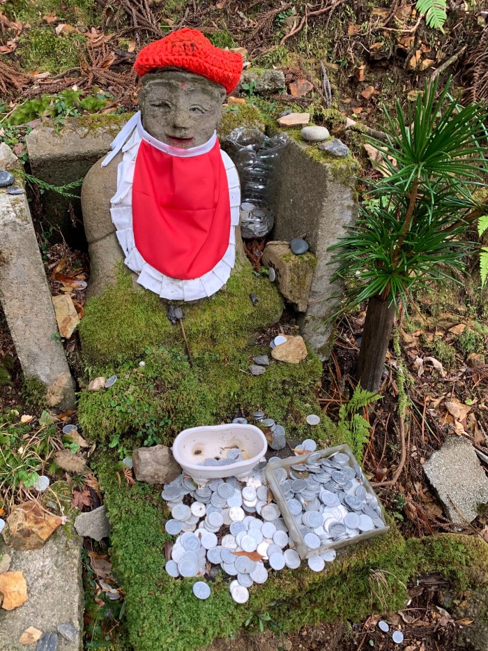 Many statues of Buddha wear red bibs. Jizo is one of the key representations of Buddha in Japan, and one of his jobs is to protect children. It is said that the bibs placed on the statues reflect this role, and red is the colour to ward off evil.