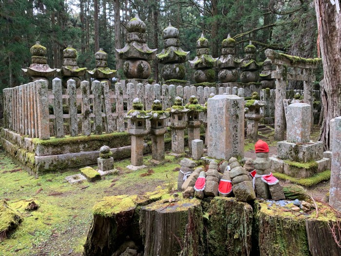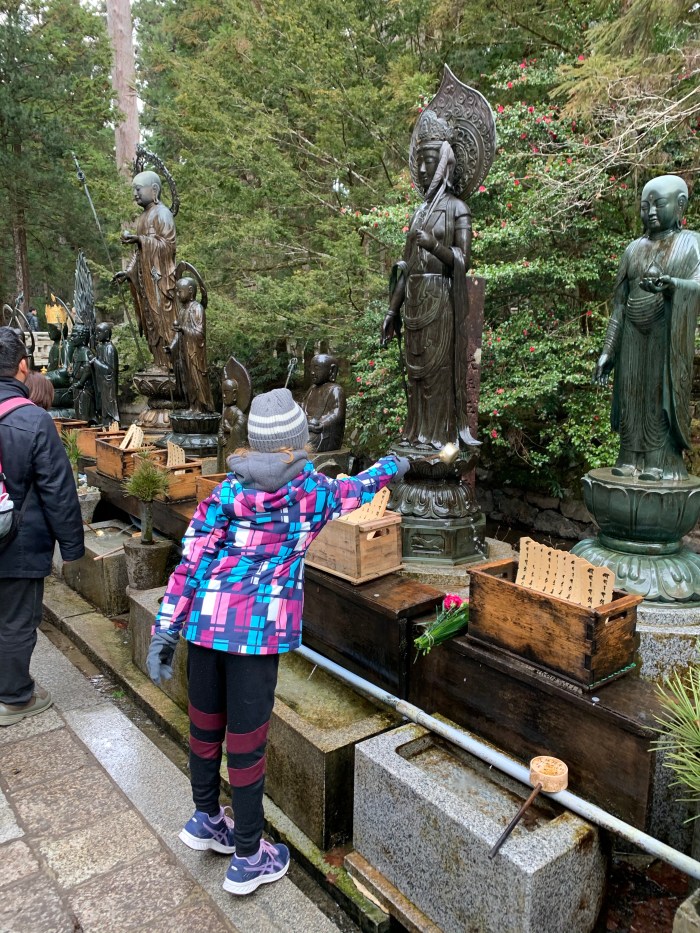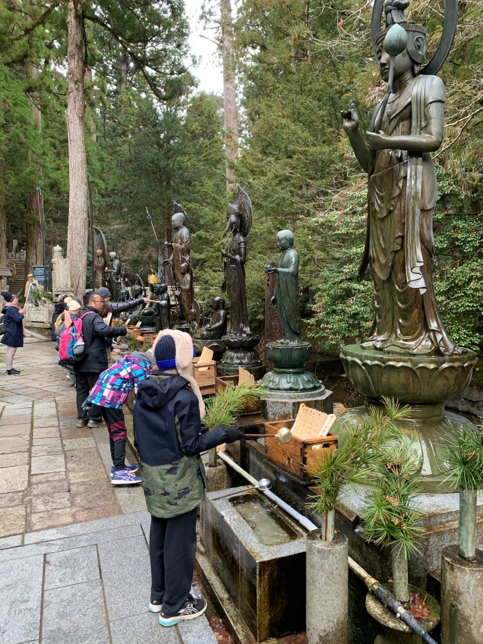 Before the Gobyo no hashi Bridge, which leads to Kobo Daishi’s mausoleum, a series of statues of Buddha stand, and it is customary to splash them with water to become clean before entering the most sacred section of Okunoin.