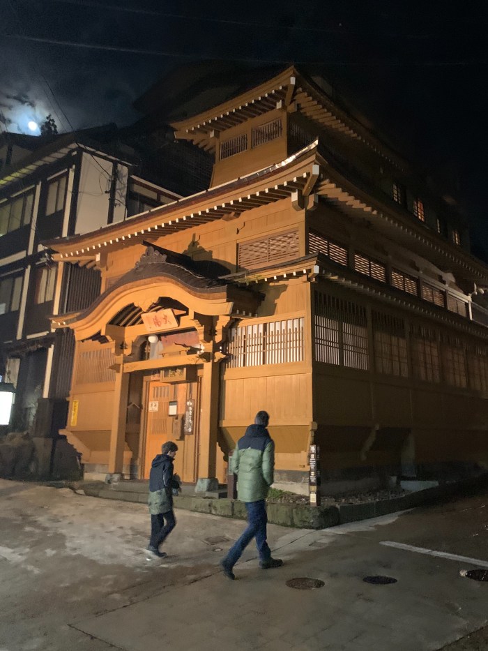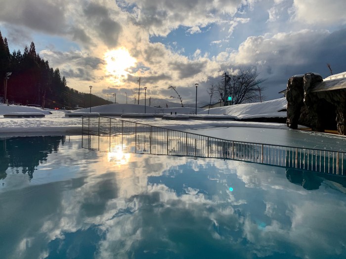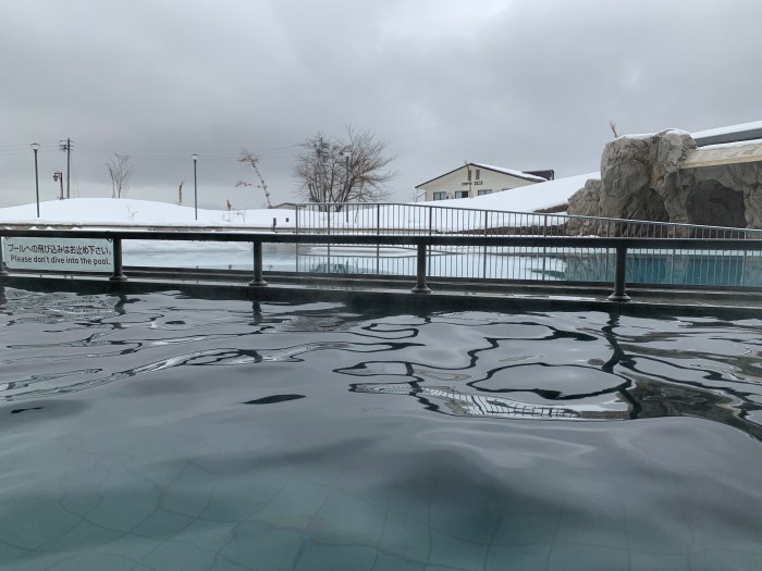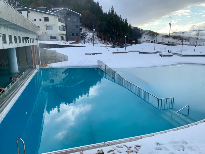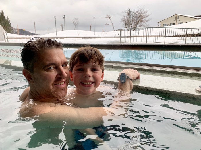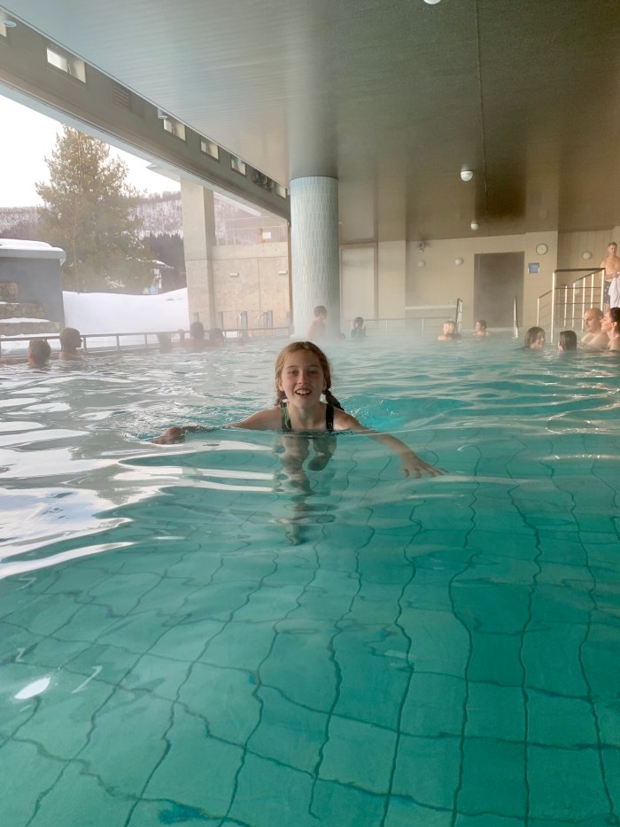 The good news is there is one spot in town with a big hot spring pool that allows everyone to take a dip together, swimming costumes on, for an entry fee. So, on the day when we took one ski run in the rain and then decided that it wasn’t much fun, we headed up the hill to Nozawa Spa Arena for a relaxing hot bath, looking out at the snow.