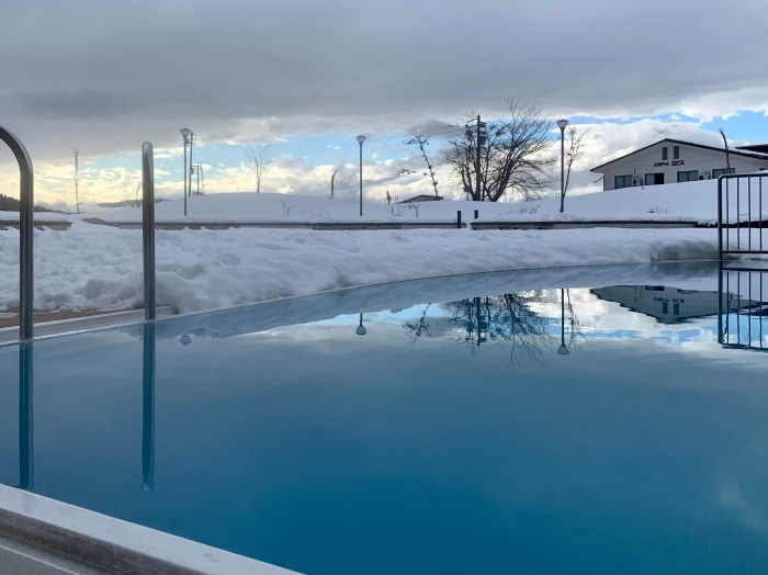 The outside pool is open in summer but not heated in winter, so it was closed and icing over.