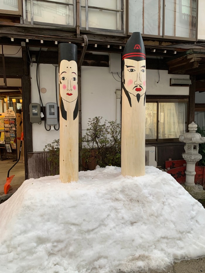 The Dosojin are important in Nozawa – Shinto-Buddhist deities of roads and borders whose role it is to ward off evil spirits. In Nozawa Village, they’re traditionally depicted as a man and a woman, painted wooden totems, and their guardianship extends to marriage and fertility.