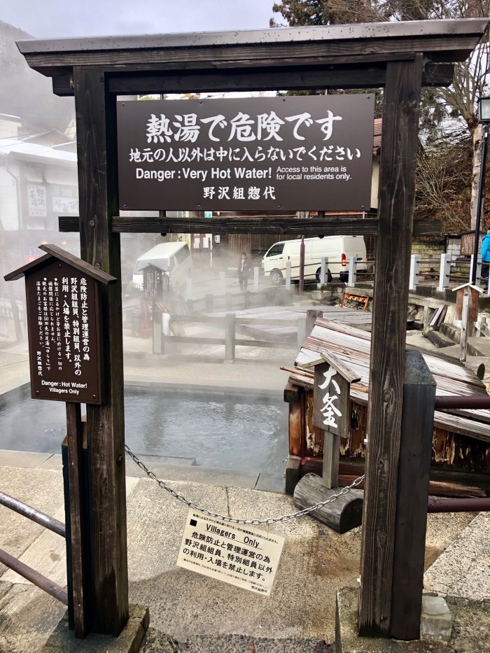 Most of the hotels and guest houses have onsen facilities, which means there’s a communal bath and shower room that visitors can use. There are also public onsen, called Soto-Yu, sprinkled around the village, where anyone can pop in and enjoy a soak for free. The thing about the public onsen, however, is that Japanese custom dictates that you’re naked – no swimming attire allowed. They’re separated into male and female baths, so this is ok. But, that ruled out the kids. (Come on, people, you’re ten years old – no one cares!) As for me? When in Japan, right? I set aside my self-consciousness and took a couple of trips to the local baths – and boy were they hot! This one is O-Yu, at the centre of the village.